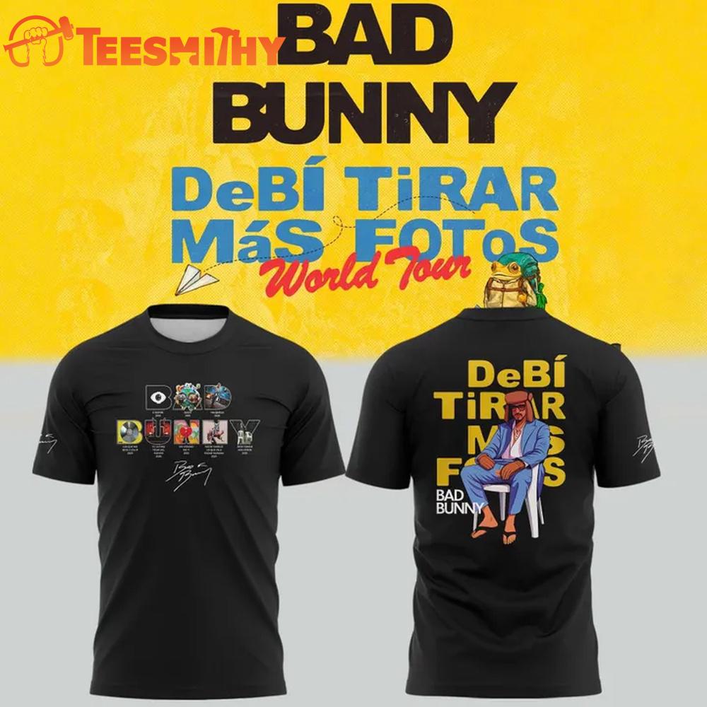 Bad Bunny x Debi Tirar Mas Fotos World Tour 2026 Black T Shirt The 3D Shirt is a fashion statement that goes beyond the ordinary. Using advanced printing technology, it brings designs to life with depth and vividness. Crafted from high-quality materials, it offers comfort and durability. The three-dimensional graphics create a captivating effect that’s perfect for casual wear or making a bold statement.
