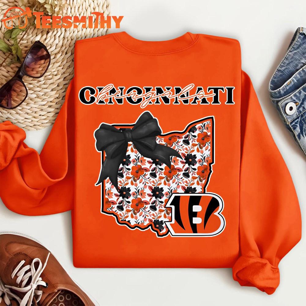 Cincinnati Bengals 2025 NFL Cozy State Bow Sweatshirt The 3D Shirt is a fashion statement that goes beyond the ordinary. Using advanced printing technology, it brings designs to life with depth and vividness. Crafted from high-quality materials, it offers comfort and durability. The three-dimensional graphics create a captivating effect that’s perfect for casual wear or making a bold statement.