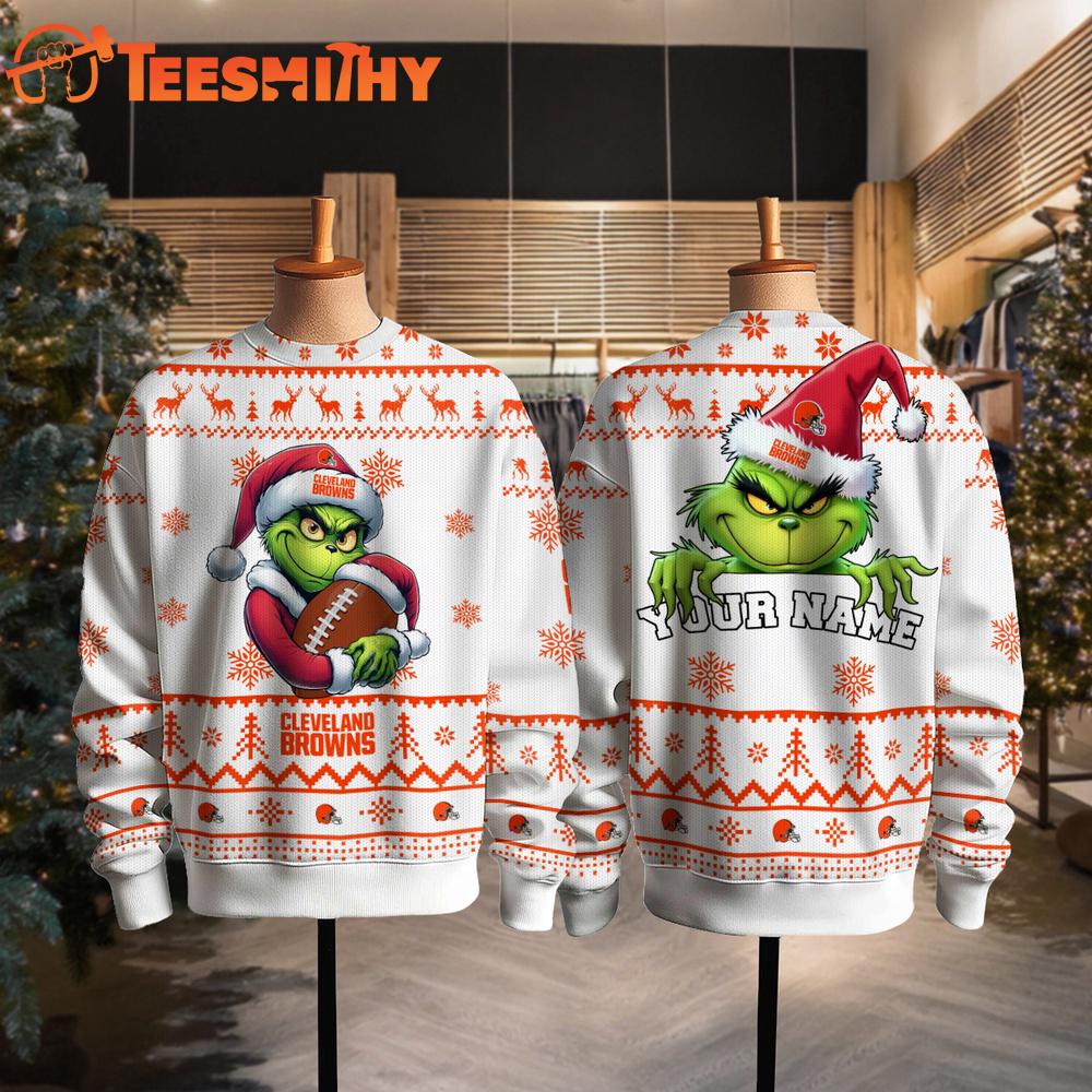 Cleveland Browns NFL Grinch Santa Hats Ugly Christmas Sweater Get into the festive spirit with our Ugly Christmas Sweater! Made from soft, cozy fabric, it offers warmth and comfort while showcasing fun, colorful holiday designs. Perfect for Christmas parties, family gatherings, or casual wear, this sweater spreads cheer and laughter all season long.