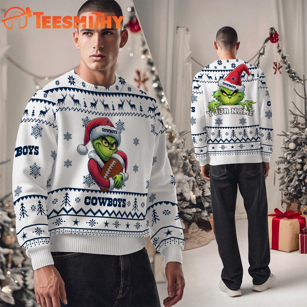 Dallas Cowboys NFL Grinch Santa Hats Ugly Christmas Sweater Get into the festive spirit with our Ugly Christmas Sweater! Made from soft, cozy fabric, it offers warmth and comfort while showcasing fun, colorful holiday designs. Perfect for Christmas parties, family gatherings, or casual wear, this sweater spreads cheer and laughter all season long.