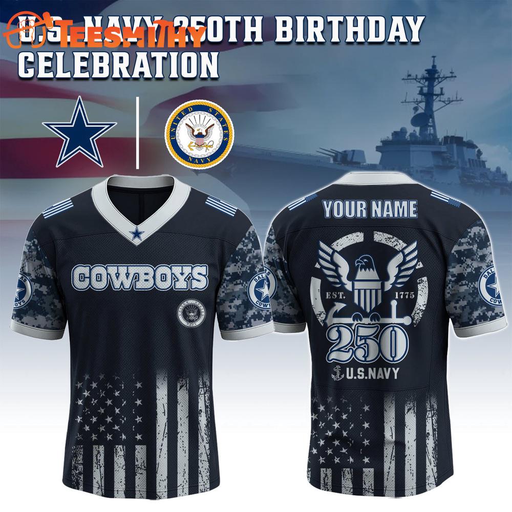 Dallas Cowboys U.S. Navy 250th Birthday Football Jersey Show your team spirit with our custom Football Jersey! Made from high-quality, breathable fabric for maximum comfort and performance. Perfect for game day or casual wear. Personalize with your name, number, or favorite team. A must-have for any football fan or sports enthusiast.