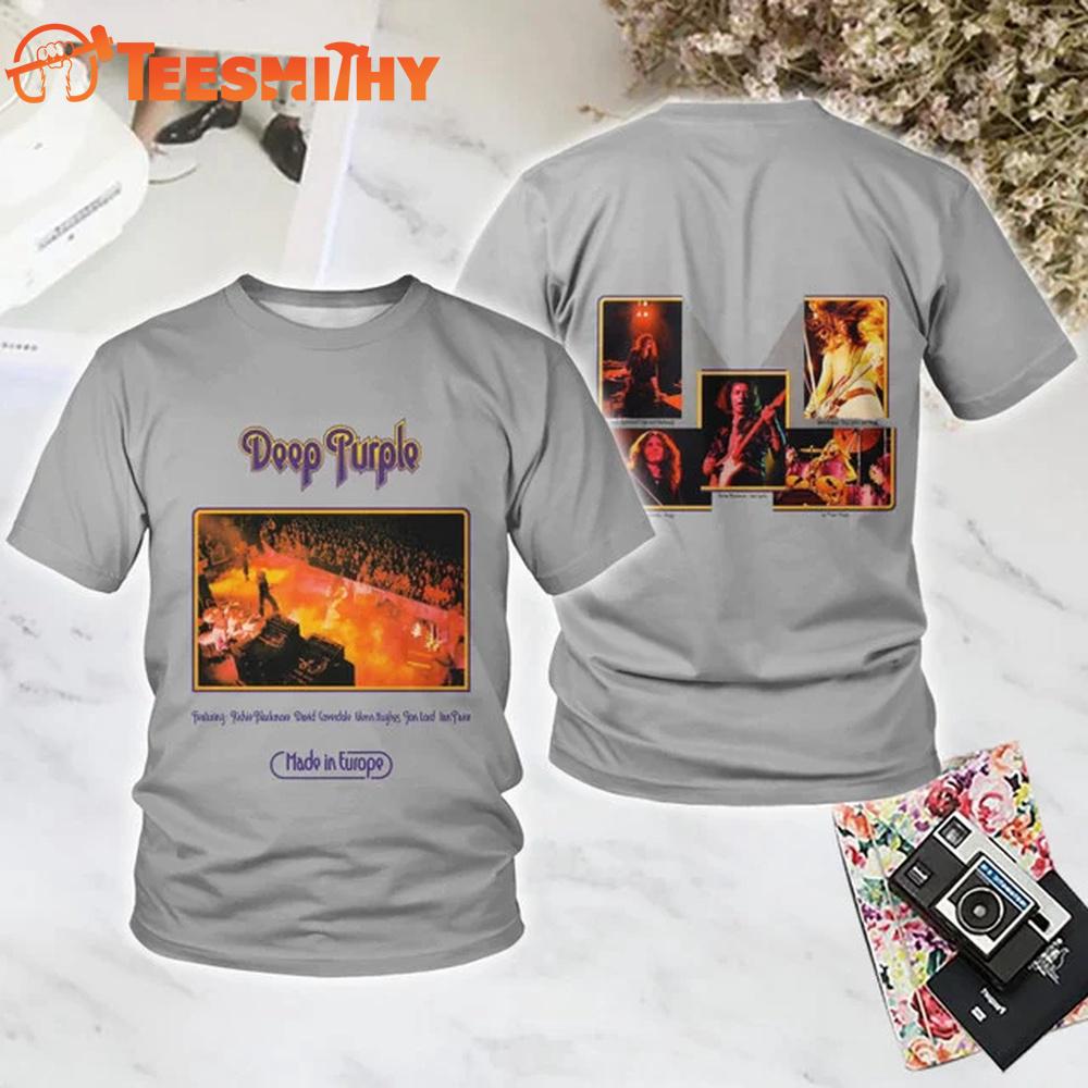 Deep Purple Made in Europe All Over Print T Shirt The 3D Shirt is a fashion statement that goes beyond the ordinary. Using advanced printing technology, it brings designs to life with depth and vividness. Crafted from high-quality materials, it offers comfort and durability. The three-dimensional graphics create a captivating effect that’s perfect for casual wear or making a bold statement.