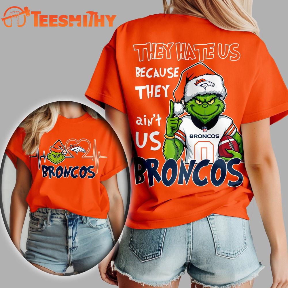 Product details: Denver Broncos 2025 NFL Christmas Grinch They Hate Us All Over Print Shirt