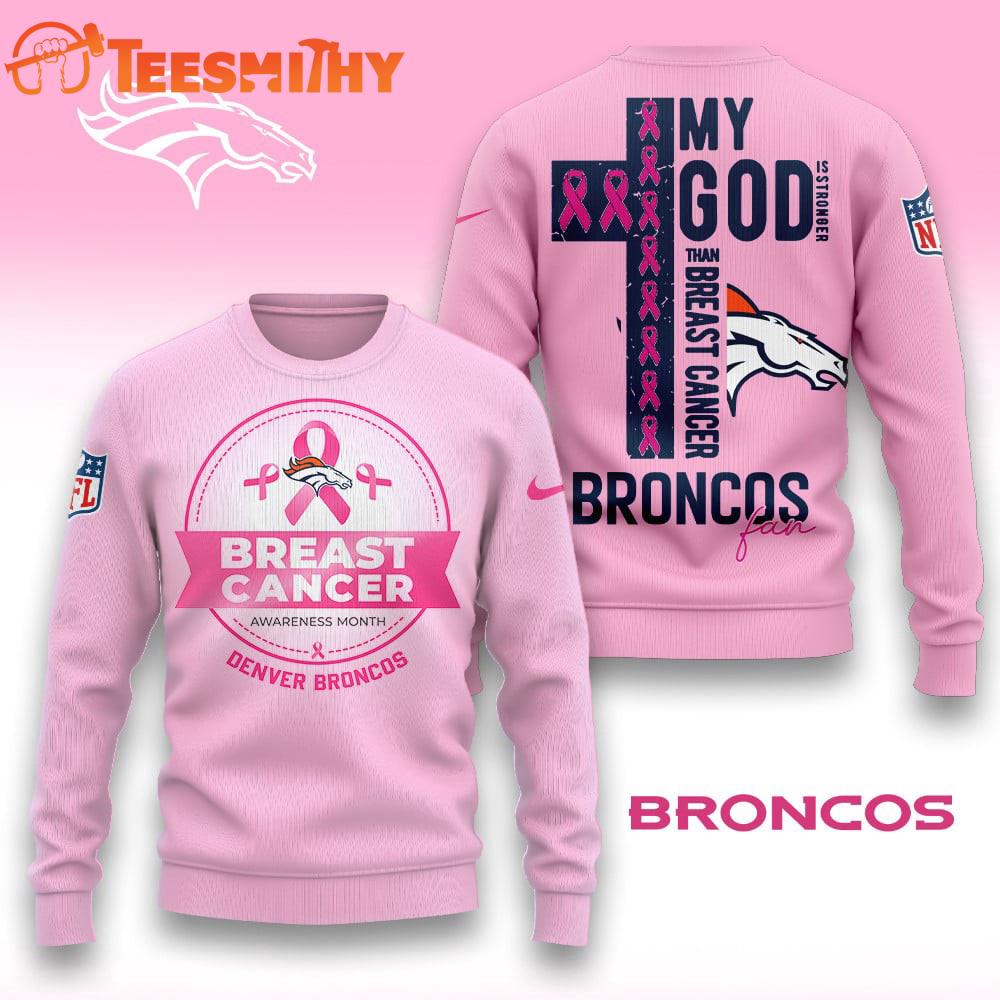 Photos Of Denver Broncos 2025 NFL My God Is Stronger Than Breast Cancer Chritmas Sweater