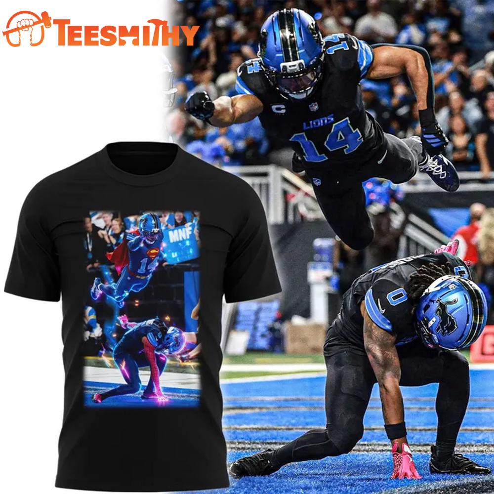 Detroit Lions Amon-Ra St. Brown And Jahmyr Gibbs Superman x Spider Man Celly T Shirt The 3D Shirt is a fashion statement that goes beyond the ordinary. Using advanced printing technology, it brings designs to life with depth and vividness. Crafted from high-quality materials, it offers comfort and durability. The three-dimensional graphics create a captivating effect that’s perfect for casual wear or making a bold statement.
