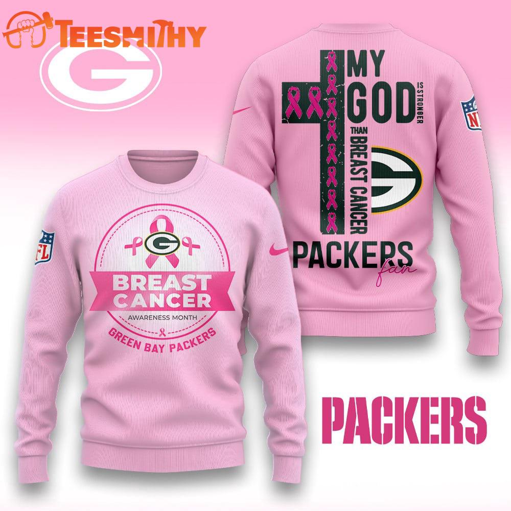 Product details: Green Bay Packers 2025 NFL My God Is Stronger Than Breast Cancer Chritmas Sweater