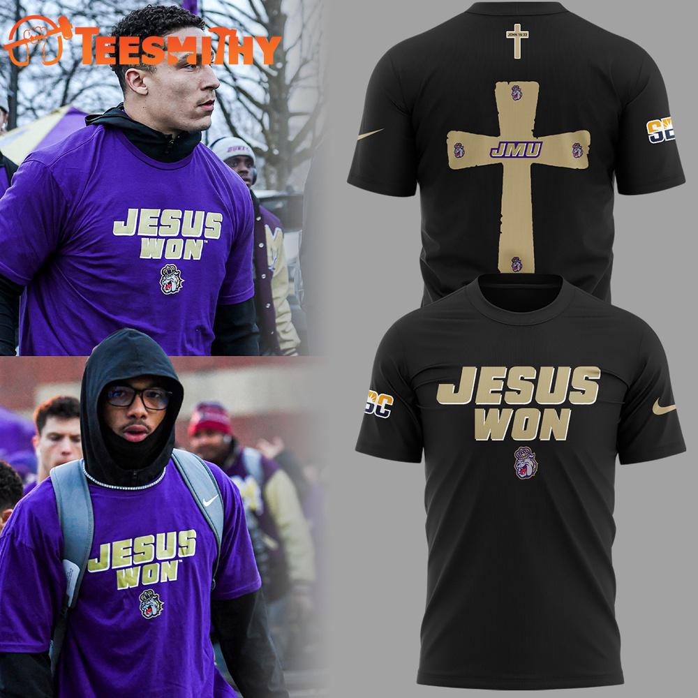 Photos Of James Madison Dukes Football 2025 JESUS WON Black Shirt