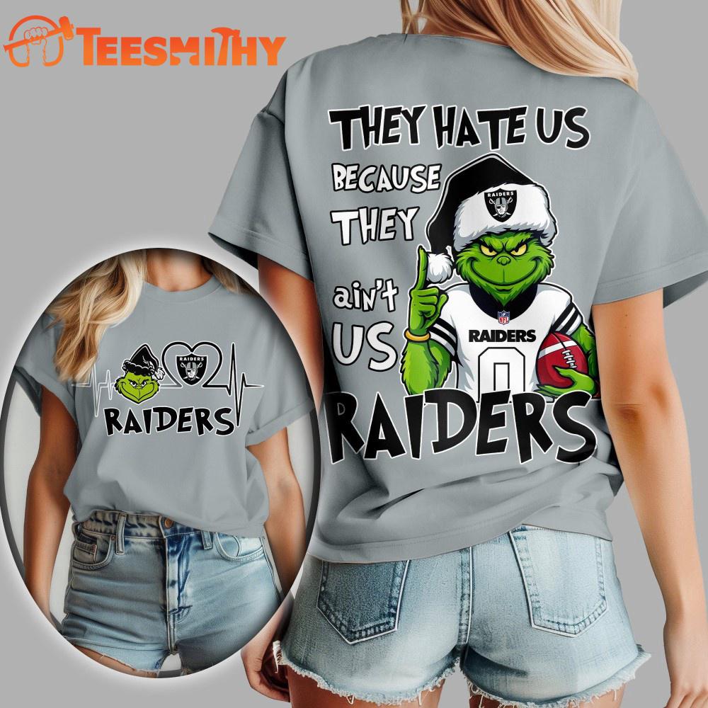 Product details: Las Vegas Raiders 2025 NFL Christmas Grinch They Hate Us All Over Print Shirt