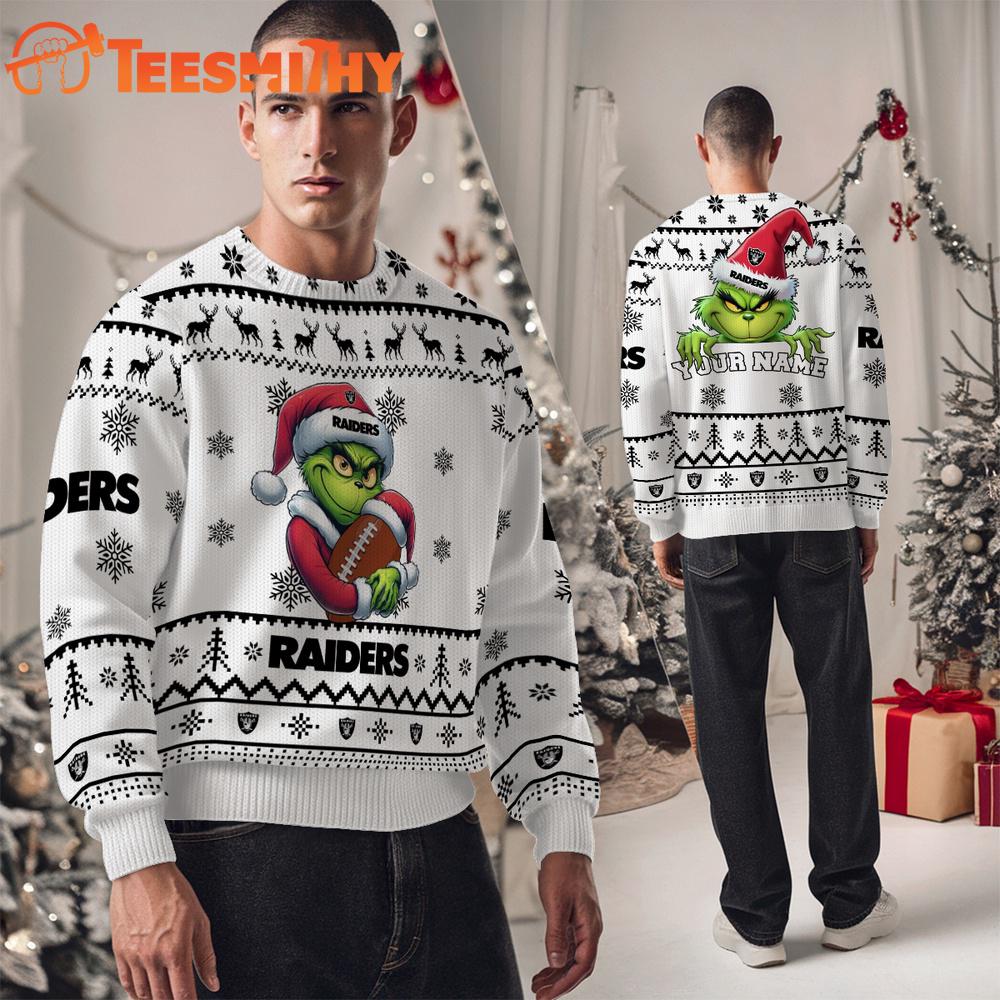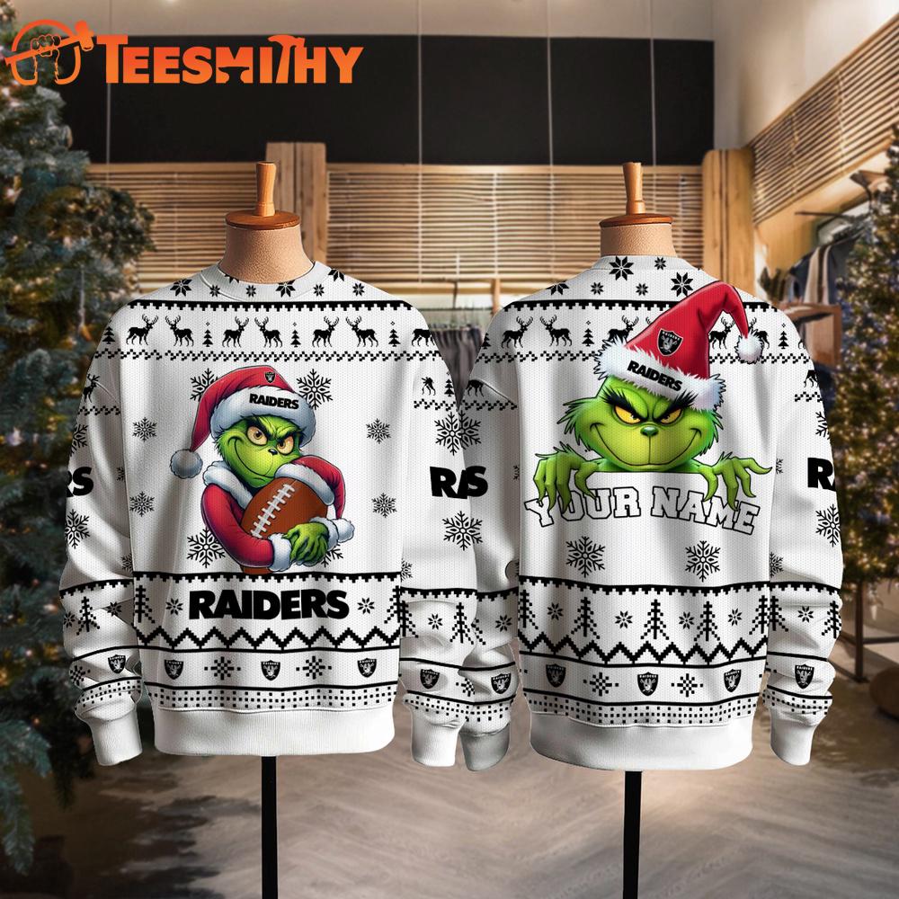 Photos Of Las Vegas Raiders NFL Grinch Santa Hats Ugly Christmas Sweater