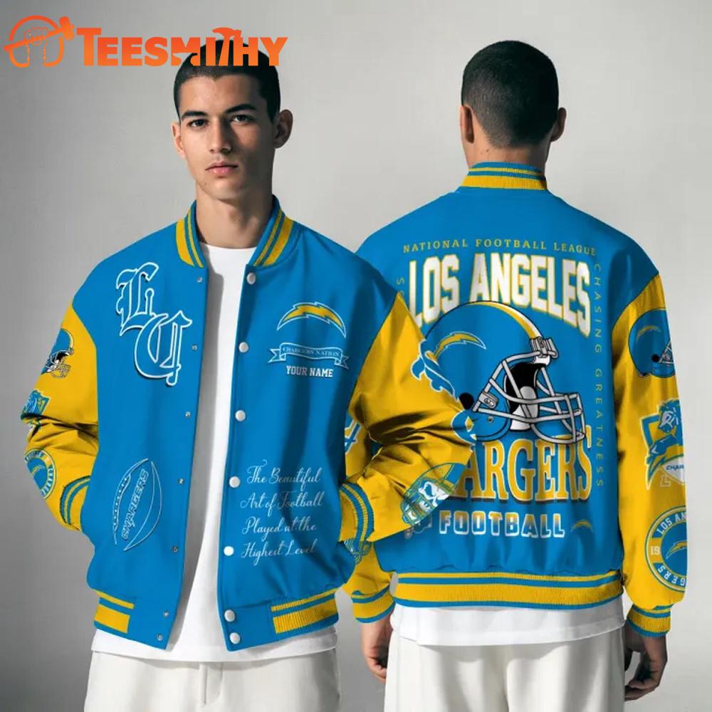 Los Angeles Chargers NFL Chasing Greatness Personalized Varsity Jacket Step up your style game with the Baseball Jacket, a timeless piece that blends classic design with modern flair. Crafted from high-quality, durable materials, this jacket features a sleek, athletic silhouette with contrasting stripes on the cuffs and collar for a nod to vintage baseball aesthetics. The soft, insulated lining ensures warmth and comfort, making it ideal for cooler days. With its versatile design, the Baseball Jacket effortlessly complements both casual and semi-formal outfits, making it a staple for any wardrobe. Elevate your everyday look with the iconic charm and enduring style of the Baseball Jacket.