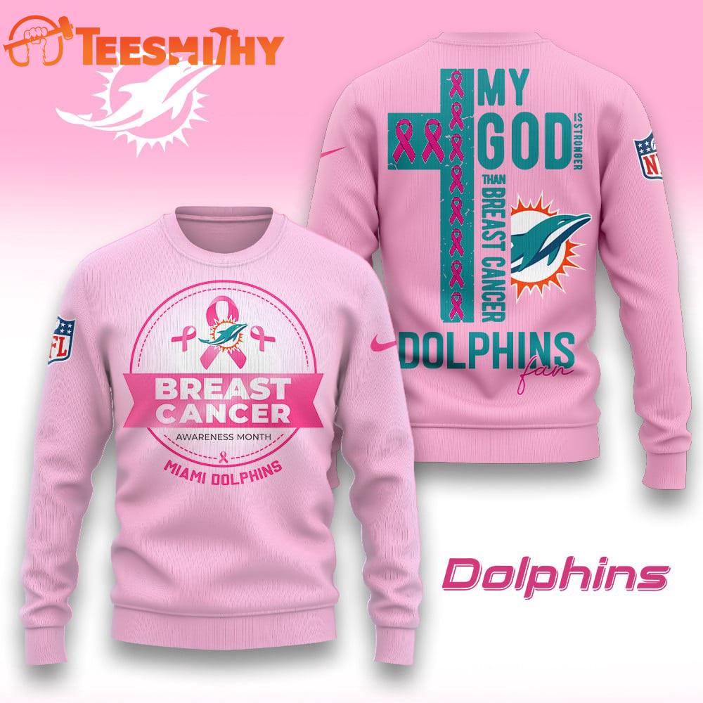 Product details: Miami Dolphins 2025 NFL My God Is Stronger Than Breast Cancer Chritmas Sweater