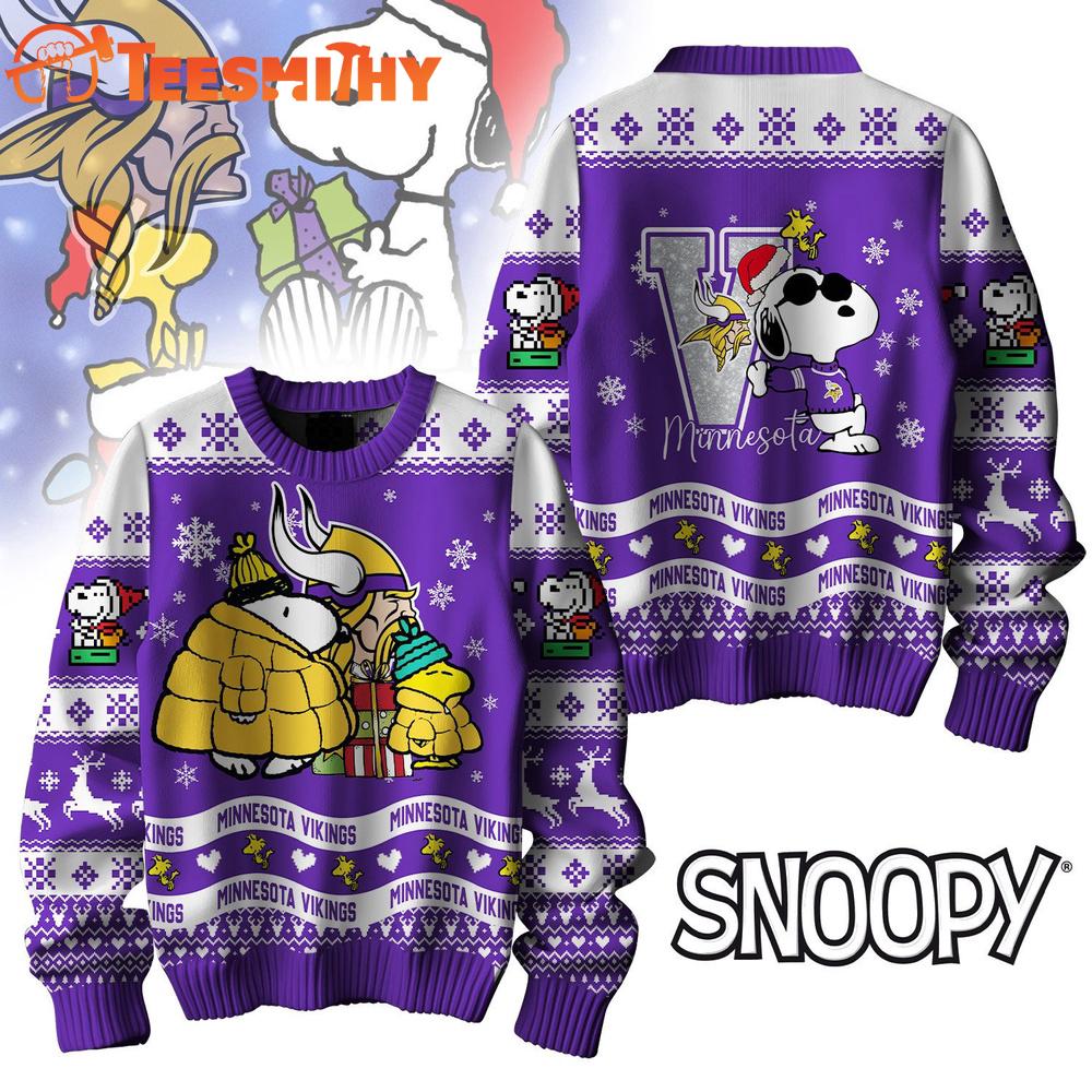 Photos Of Minnesota Vikings 2025 NFL Peanuts Snoopy Funny Christmas Ugly Sweater