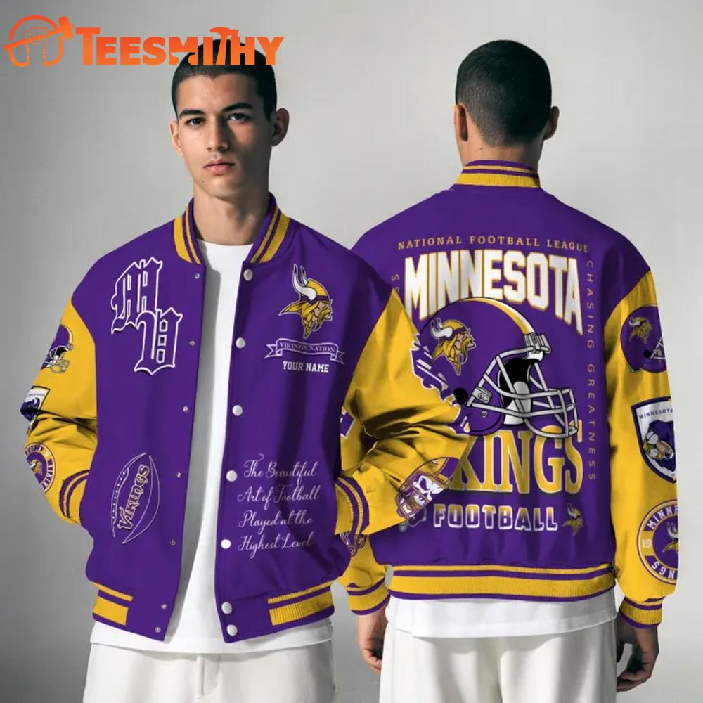 Minnesota Vikings NFL Chasing Greatness Personalized Varsity Jacket Step up your style game with the Baseball Jacket, a timeless piece that blends classic design with modern flair. Crafted from high-quality, durable materials, this jacket features a sleek, athletic silhouette with contrasting stripes on the cuffs and collar for a nod to vintage baseball aesthetics. The soft, insulated lining ensures warmth and comfort, making it ideal for cooler days. With its versatile design, the Baseball Jacket effortlessly complements both casual and semi-formal outfits, making it a staple for any wardrobe. Elevate your everyday look with the iconic charm and enduring style of the Baseball Jacket.