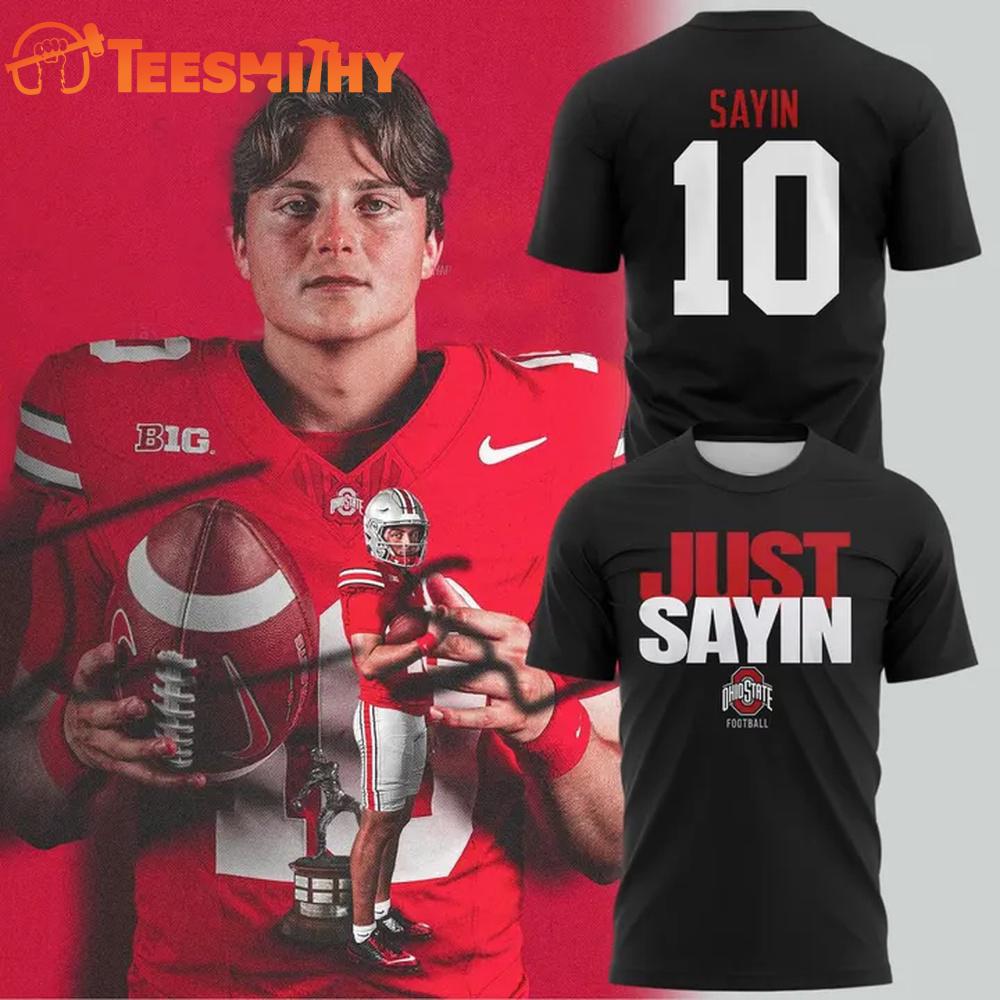 Ohio State Buckeyes Football Julian Sayin Just Sayin 2025 Black T Shirt The 3D Shirt is a fashion statement that goes beyond the ordinary. Using advanced printing technology, it brings designs to life with depth and vividness. Crafted from high-quality materials, it offers comfort and durability. The three-dimensional graphics create a captivating effect that’s perfect for casual wear or making a bold statement.