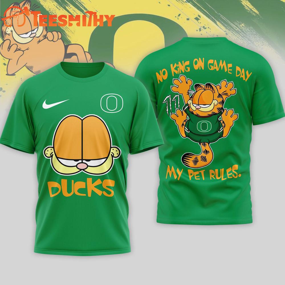 Oregon Ducks Garfield NCAA No King On Game Day 3D T Shirt The 3D Shirt is a fashion statement that goes beyond the ordinary. Using advanced printing technology, it brings designs to life with depth and vividness. Crafted from high-quality materials, it offers comfort and durability. The three-dimensional graphics create a captivating effect that’s perfect for casual wear or making a bold statement.