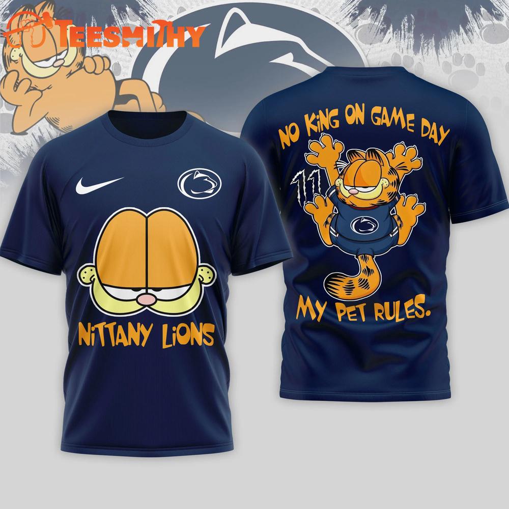 Penn State Nittany Lions Garfield NCAA No King On Game Day 3D T Shirt The 3D Shirt is a fashion statement that goes beyond the ordinary. Using advanced printing technology, it brings designs to life with depth and vividness. Crafted from high-quality materials, it offers comfort and durability. The three-dimensional graphics create a captivating effect that’s perfect for casual wear or making a bold statement.