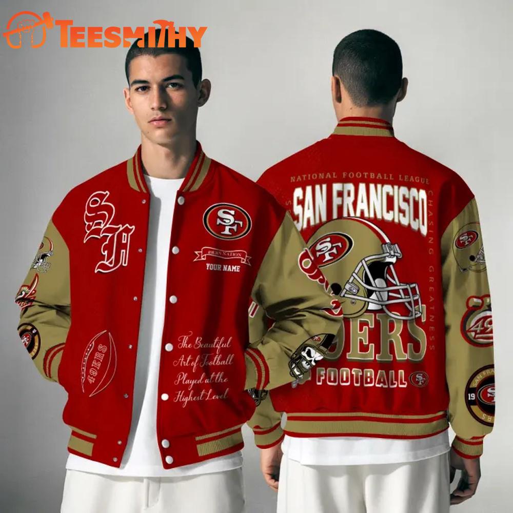 San Francisco 49ers NFL Chasing Greatness Personalized Varsity Jacket Step up your style game with the Baseball Jacket, a timeless piece that blends classic design with modern flair. Crafted from high-quality, durable materials, this jacket features a sleek, athletic silhouette with contrasting stripes on the cuffs and collar for a nod to vintage baseball aesthetics. The soft, insulated lining ensures warmth and comfort, making it ideal for cooler days. With its versatile design, the Baseball Jacket effortlessly complements both casual and semi-formal outfits, making it a staple for any wardrobe. Elevate your everyday look with the iconic charm and enduring style of the Baseball Jacket.