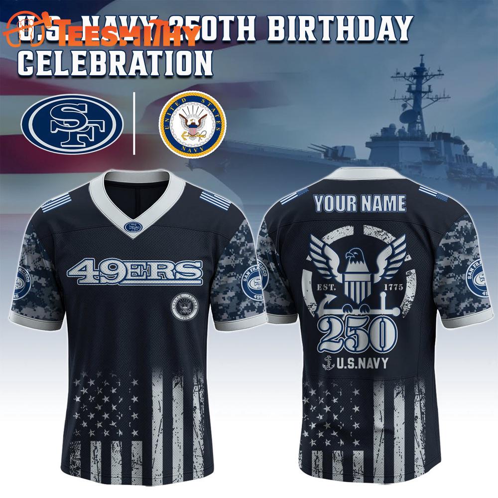 San Francisco 49ers U.S. Navy 250th Birthday Limited Edition Football Jersey Show your team spirit with our custom Football Jersey! Made from high-quality, breathable fabric for maximum comfort and performance. Perfect for game day or casual wear. Personalize with your name, number, or favorite team. A must-have for any football fan or sports enthusiast.