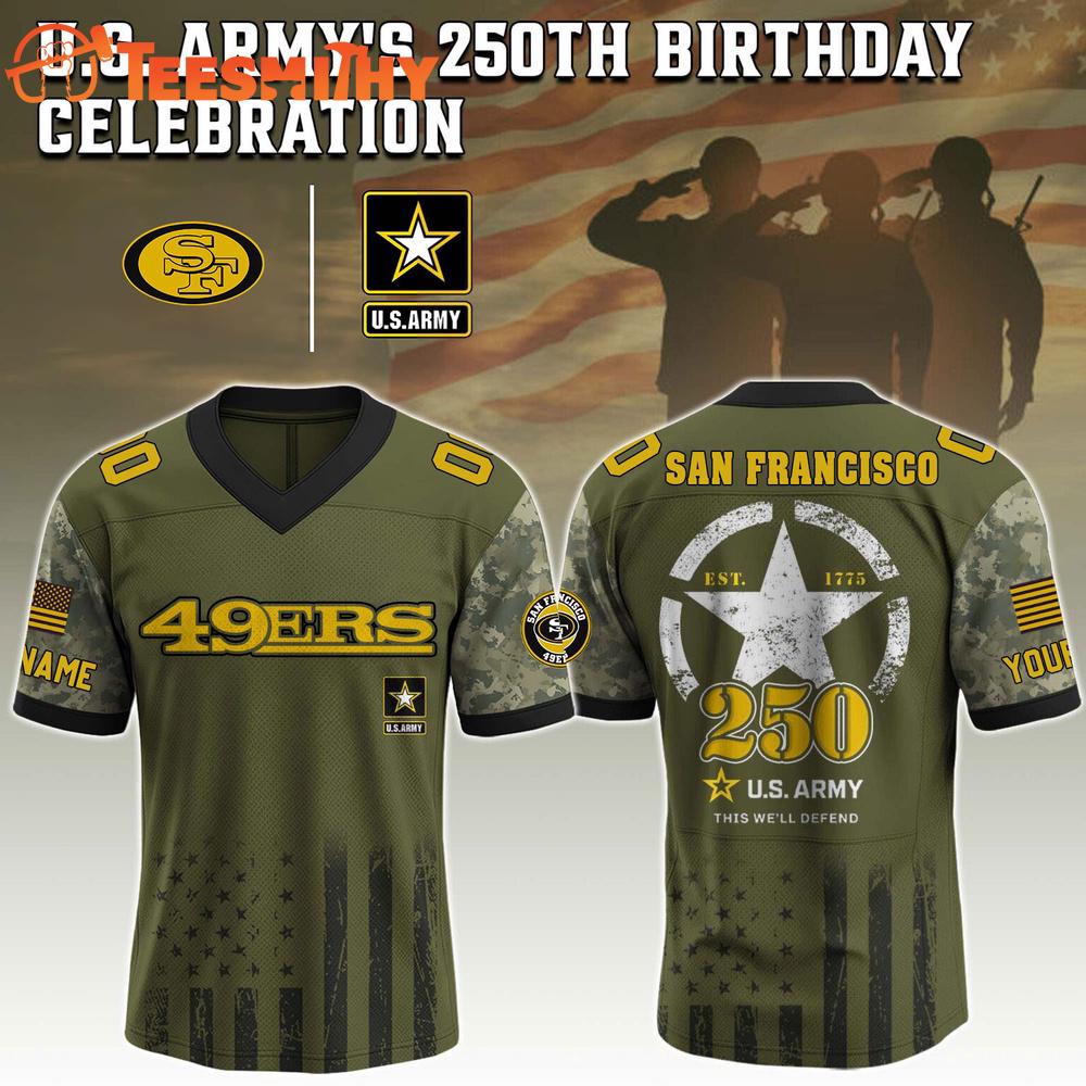 Special Edition 2025 U.S. ARMY’S 250TH Birthday x San Francisco 49ers Football Jersey Show your team spirit with our custom Football Jersey! Made from high-quality, breathable fabric for maximum comfort and performance. Perfect for game day or casual wear. Personalize with your name, number, or favorite team. A must-have for any football fan or sports enthusiast.